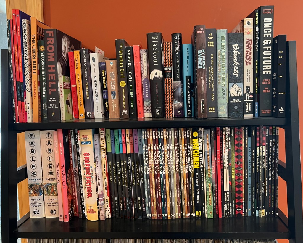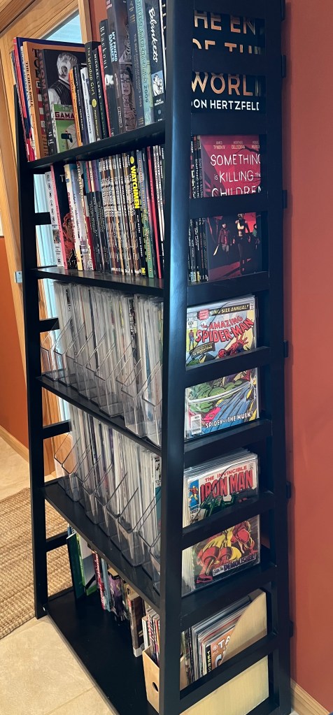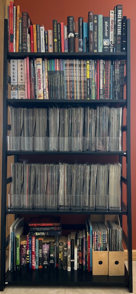 • He’s also organized – my kids don’t have their books in any organized fashion – so he’s giving off mild collector vibes – I didn’t see a lot (or any) plastic sleeves – correction – went back, saw sleeves – but they also looked gently used so maybe I’m guessing living life and enjoying art is more important to him than possessing things – if that feeling extends to his romantic interests, another green flag ?